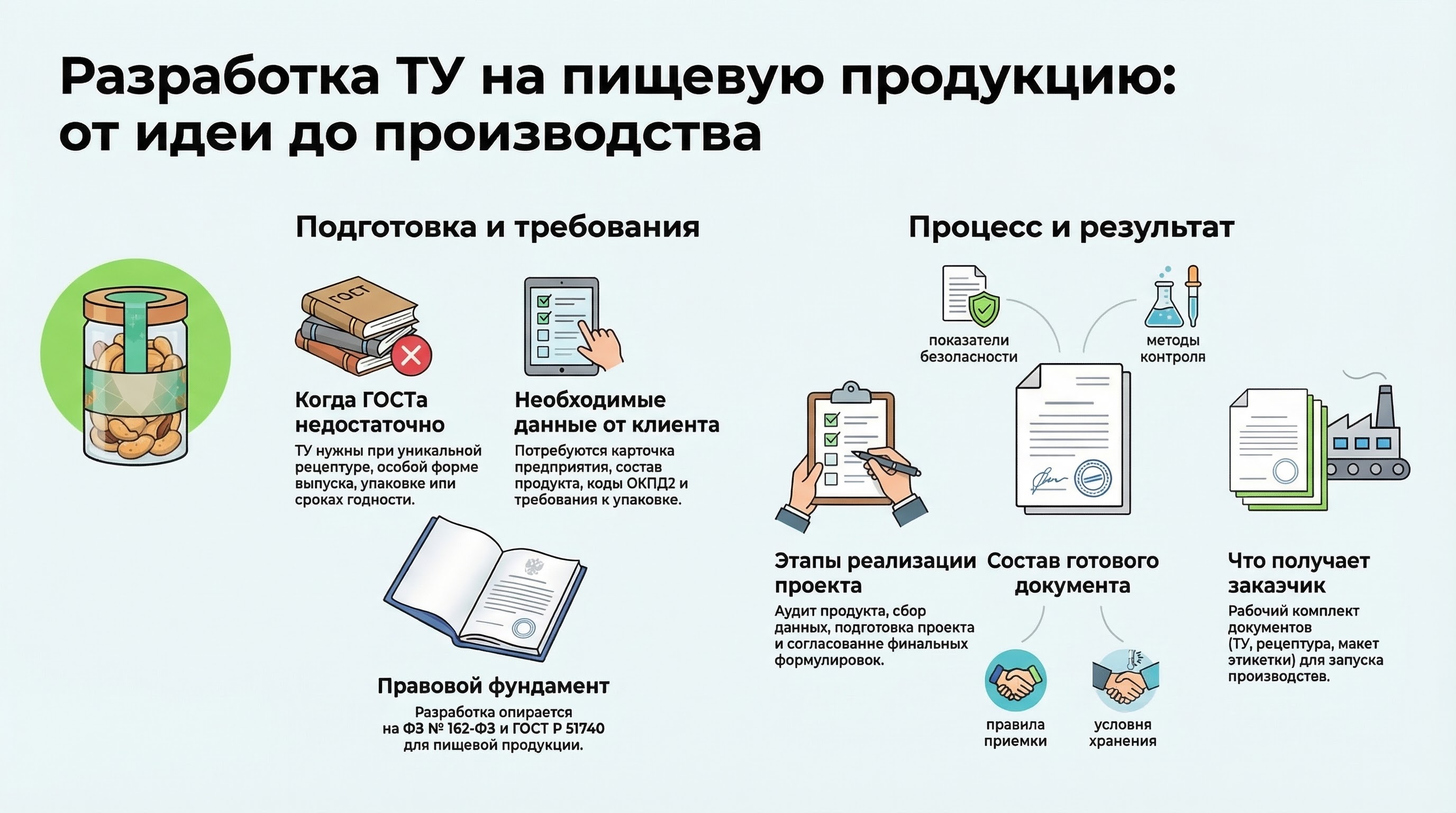 Разработка технических условий на пищевую продукцию идет по понятному рабочему сценарию: