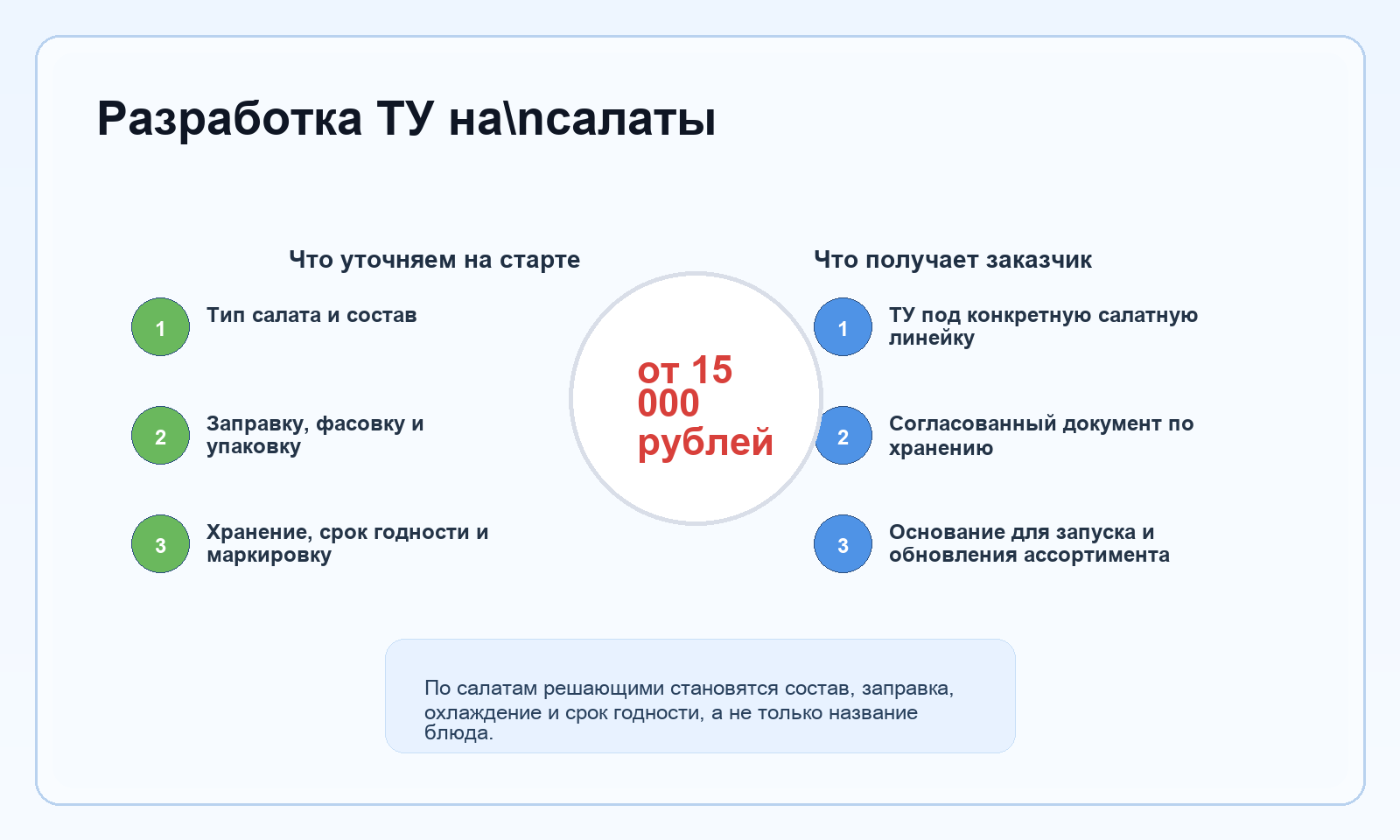 Для салатов мы собираем не просто описание блюда, а рабочую схему того, как продукт должен выйти из кухни и дойти до продажи без потери качества. Поэтому здесь особенно важно не размывать мелочи: один лишний ингредиент, другой контейнер или новая заправка могут изменить весь документ.